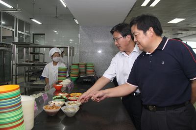 9月11日上午,校党委书记郑勇、党委副书记刘文宇在党委宣传部部长朱延华、饮食服务总公司总经理相井成的陪同下来到南苑、北苑以及学苑食堂,视察最近的食堂工作,并与部分已经来到学校的新生及家长就食堂的饮食、服务等方面进行了全面的沟通交流。