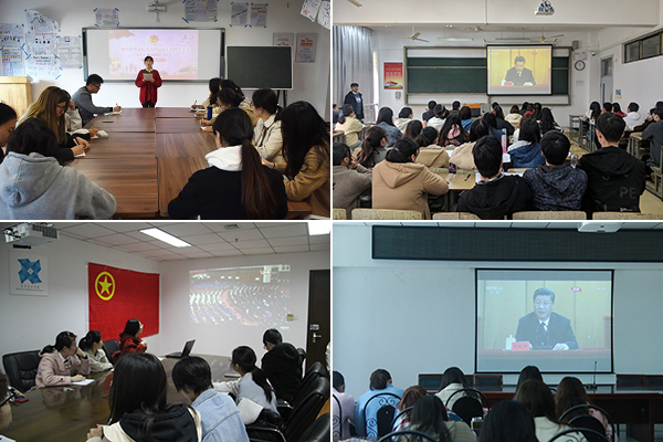 图为淮师青年观看纪念五四运动100周年大会直播分会场。供图各学院