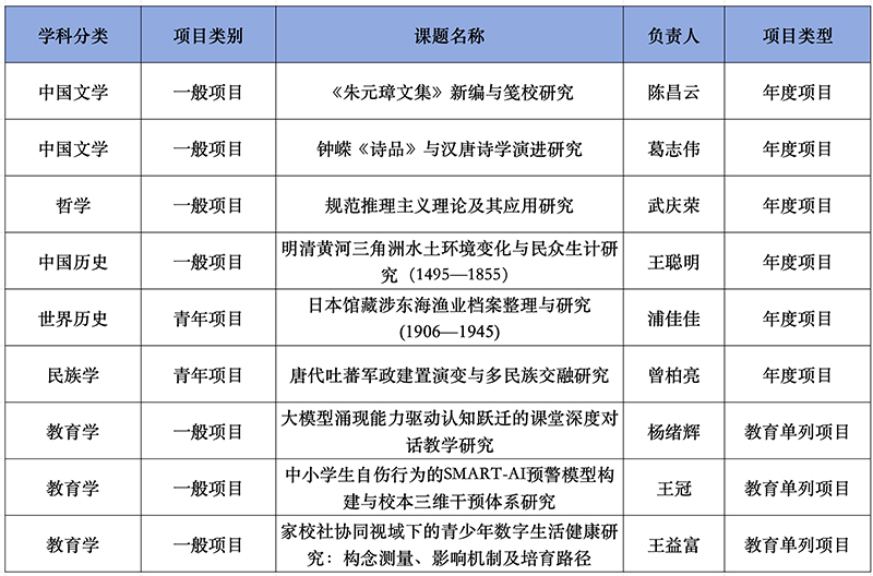 淮师新闻网10月4日电(记者 胡风霞)近日,全国哲学社会科学工作办公室正式公布了2025年国家社会科学基金年度项目立项名单。淮阴师范学院共有6个项目获批立项。此前,全国教育科学规划项目立项名单已公布,淮师立项3项。截至目前,今年淮师国家社科基金项目总立项数达9项(含单列学科),包括一般项目7项、青年项目2项。