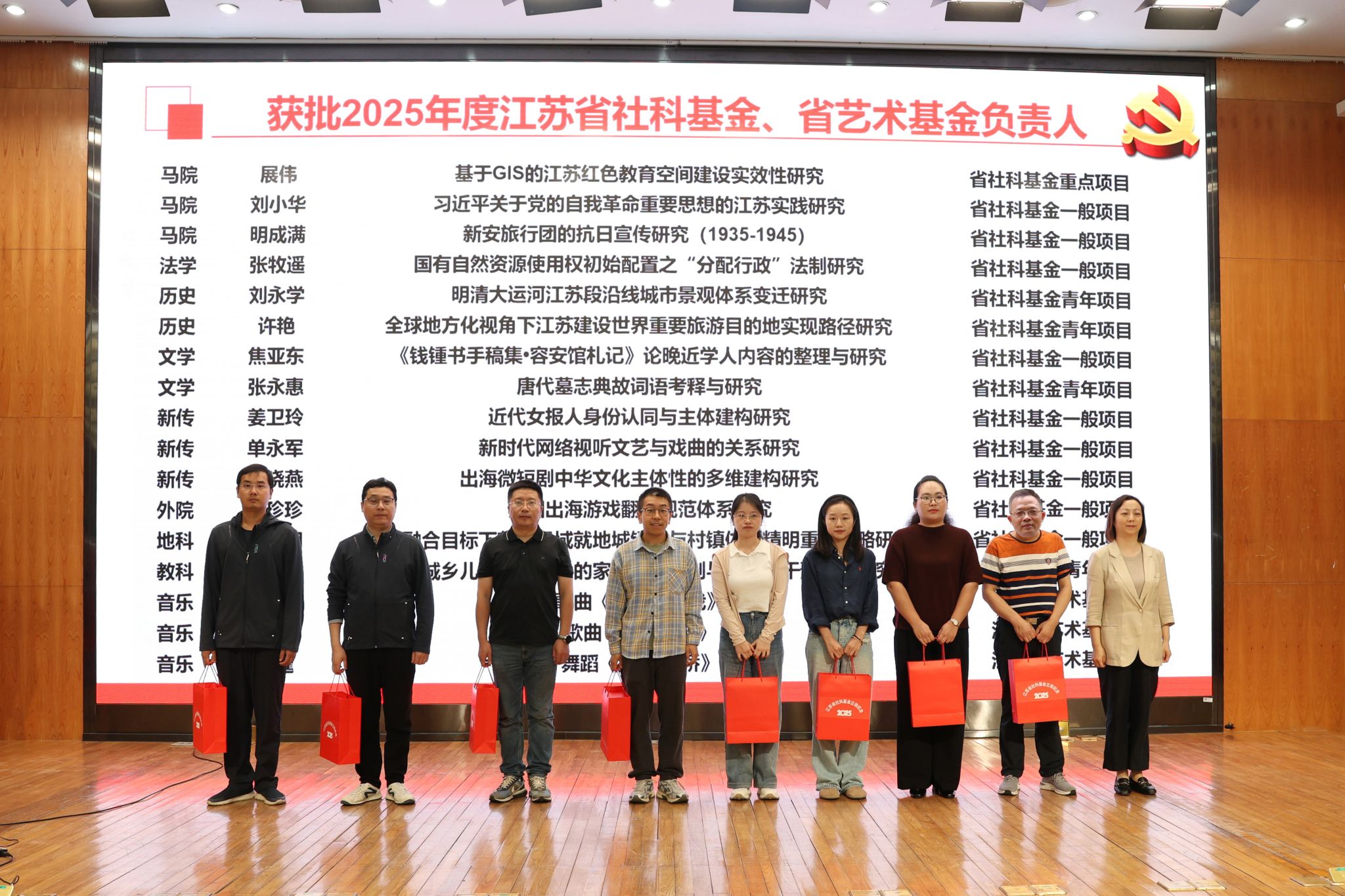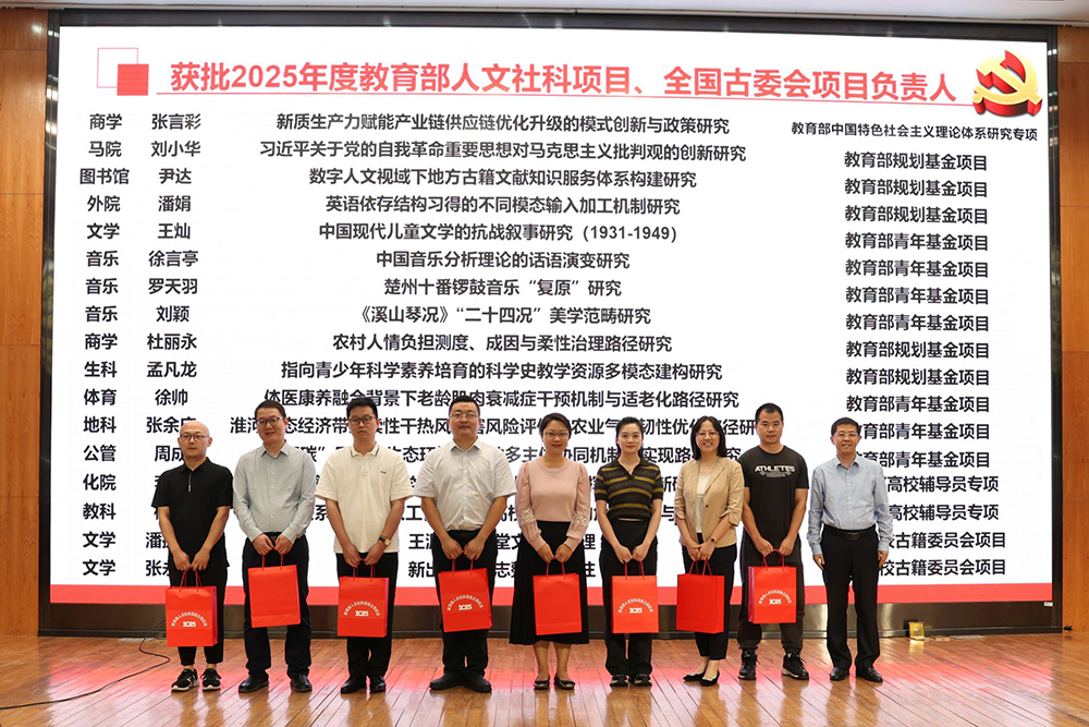 会议表彰了获批本年度国家社科基金、教育部人文社科项目、省社科基金、省艺术基金,以及全国高校古委会项目的41位项目负责人,赵祥祥代表学校向立项老师表示热烈祝贺并颁发纪念品。
