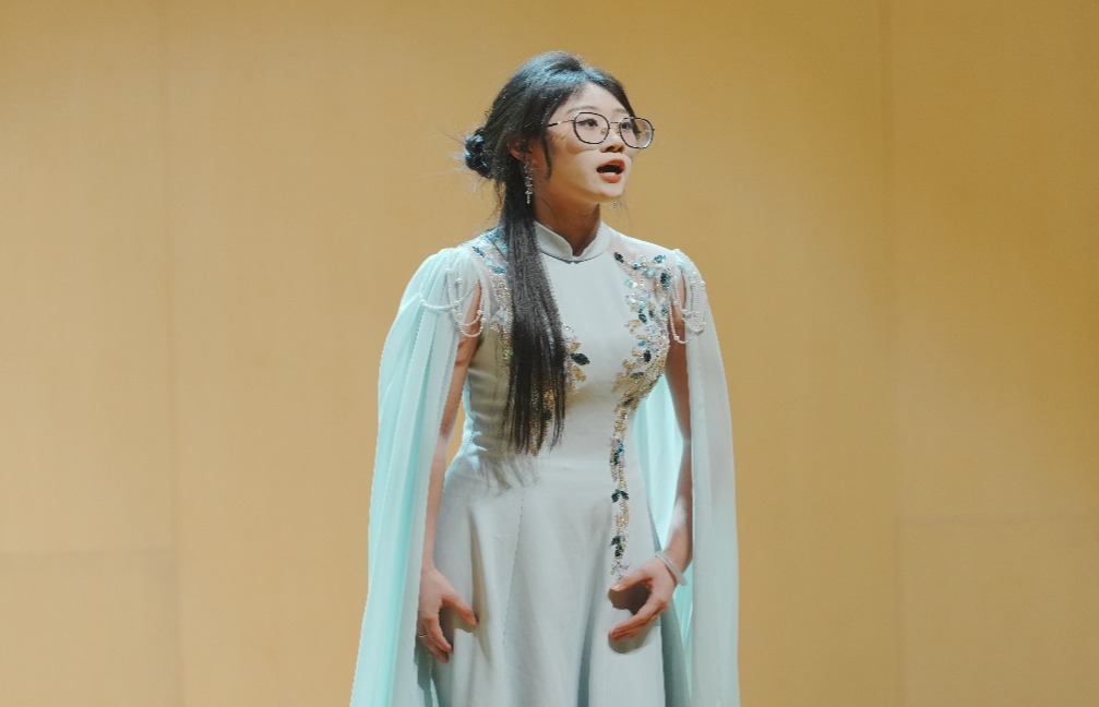 音乐会在深情婉转的《我的爱人你可听见》中拉开帷幕。该曲作为歌剧《长征》的经典选段,学子以细腻的情感处理与扎实的气息控制,将革命年代夫妻间的思念与牵挂娓娓道来。演唱中,学子精准把握旋律的起伏变化,在“待到云开见日时”的高潮段落,以饱满而不张扬的音色传递炽热情感,尾句“笑看大地换人间”的气声收尾余韵悠长,瞬间将观众带入那段烽火连天却情深意重的岁月,赢得全场热烈掌声。